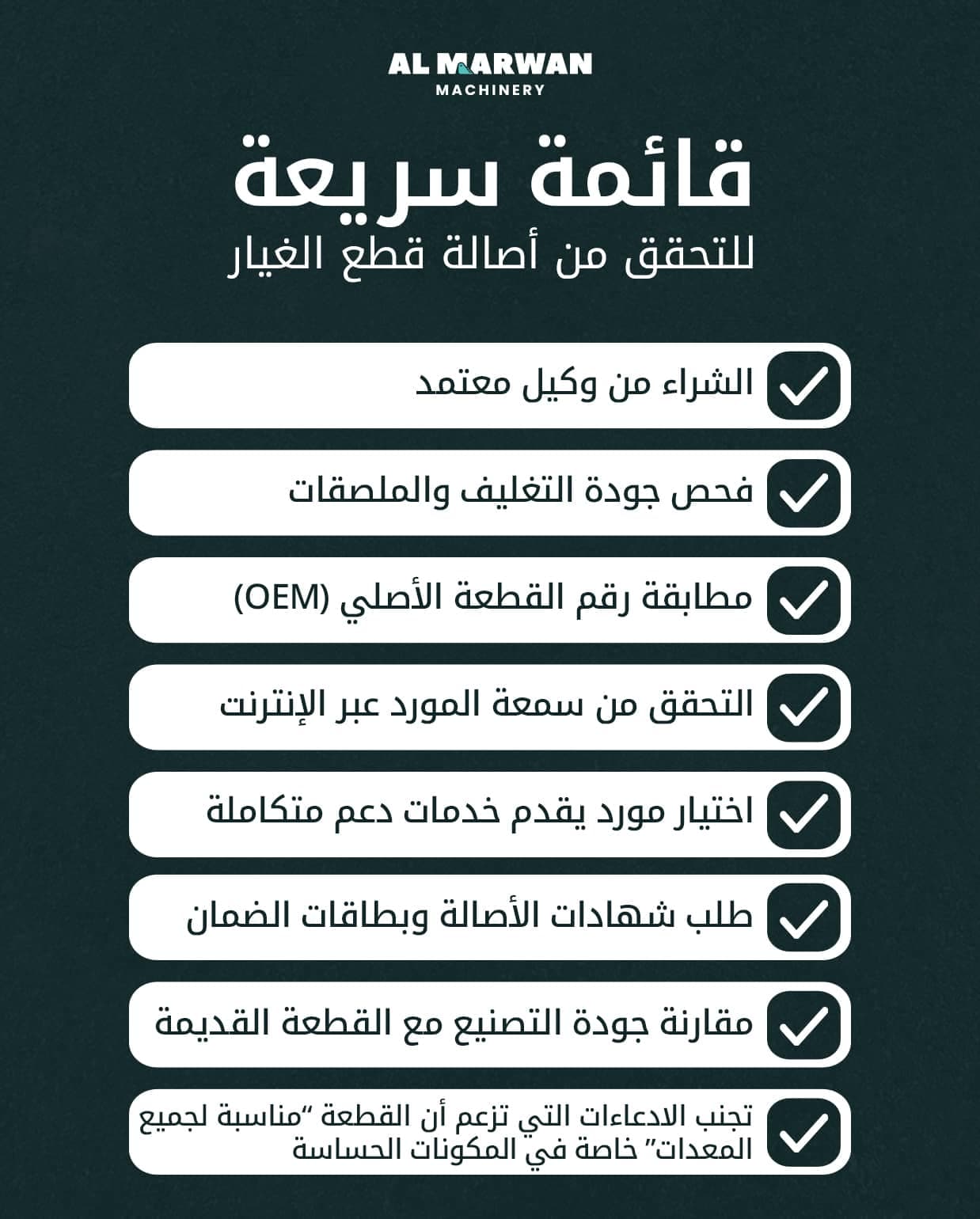 يقدم هذا الدليل الخطوات الأساسية التي تساعدك على التحقق من أصالة قطع غيار المعدات الثقيلة قبل الشراء. كما ستتعرف على كيفية مساعدة صالة عرض قطع الغيار لدى المروان للمعدات في الشارقة للمقاولين وأصحاب الأساطيل والميكانيكيين في الحصول على قطع غيار أصلية من المصنع (OEM) لعلامات عالمية مثل كوبلكو وسيفا وسينوبوم وباور سكرين وأي بي آي ماشينري وكل ذلك في مكان واحد.