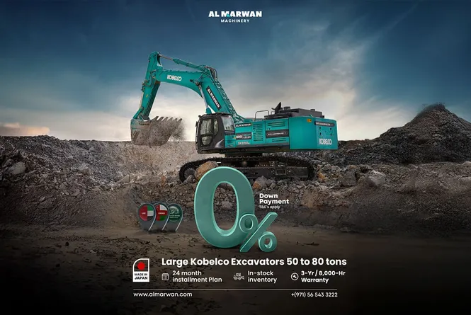 This exclusive zero downpayment offer from Al Marwan Machinery is available on a select range of large Kobelco excavators, ready for immediate deployment across the UAE, Saudi Arabia, and Oman: