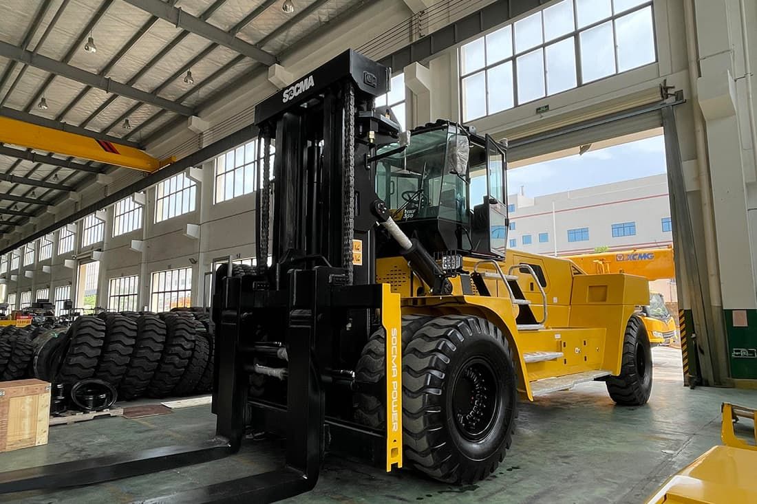 Socma HNF-350 forklift 35-ton, heavy-duty diesel forklift with 1,250 mm load center, featuring a 3.5m lift height, two-stage wide-view mast, 2,440 mm forks, hydraulic fork positioner, side shifter, full cab with AC, rear-view display, pneumatic tires, and 43,000 kg operating weight. Built for demanding applications like steel, container, port, and block handling. Ideal for industrial forklift operations in warehouses, terminals, and construction yards. Designed for durability, control, and low maintenance in tough environments.